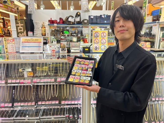 ゴールディーズ太田店の店内と金貨を持つ店長
