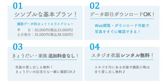 衣装:通常衣装の貸し出しなし。専用衣装、またははだかんぼうでの撮影