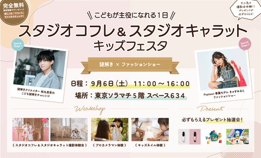 株式会社キャラット(本社:奈良県香芝市)が提供する子育て世帯に人気のフォトスタジオ「スタジオコフレ」と「スタジオキャラット」が主催の親子向け無料イベント「スタジオコフレ&スタジオキャラット キッズフェスタ」が、2025年9月6日(土)に東京ソラマチにて開催されます。