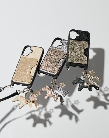 チャームと同じ“3つの運”を象徴したモチーフをケース本体にON。カードポケット付きで実用性も高く、斜めがけできるロングストラップも付属。下部で揺れる「ミニ馬」パーツが持つ人の気分を上げてくれるデザイン。