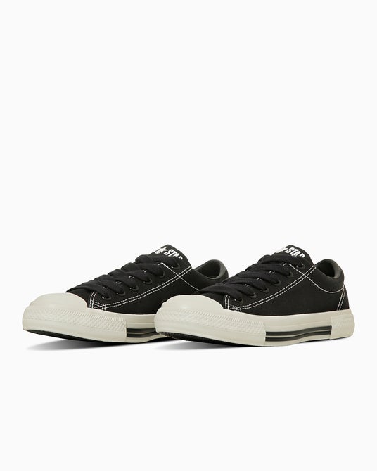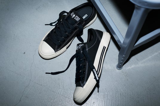 履き口とタンのフォーム、太めのシューレースが特徴のパターンアレンジモデル。キャンバス素材のアッパーにストリートテイストのデザインを採用し、コンバースロゴ入りのブラックシューレースがアクセント。