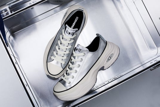 オールスターと90年代のトレーニングシューズをモチーフにした厚底ソールを採用し、流線的でレトロスポーティな印象に仕上げたサージトレーナーが登場。シルバーのレザーアッパーにより軽量化を実現し、インジェクションE.V.A.ミッドソールで履き心地が向上。