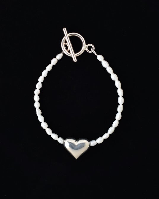 柔らかな光を宿した淡水パールと大胆なシルバーのハートモチーフを繋いだネックレス。
