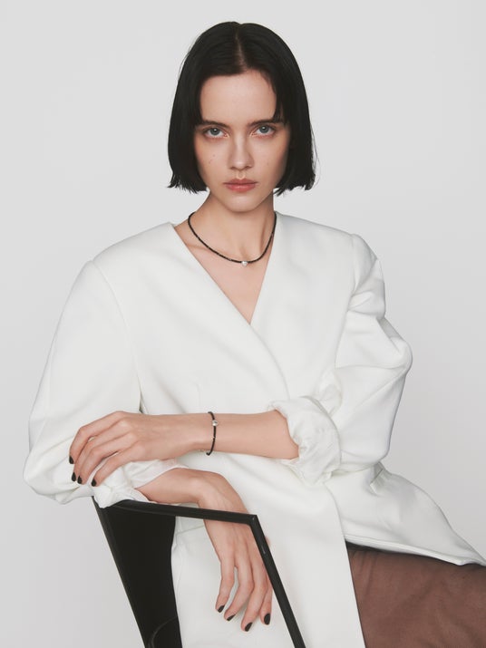 纏った瞬間に生まれるのは、潔くストイックなムード。ボタンを少し開けたデコルテに沿わせると、力の抜けた余裕とモードな強さが共存するスタイルに。