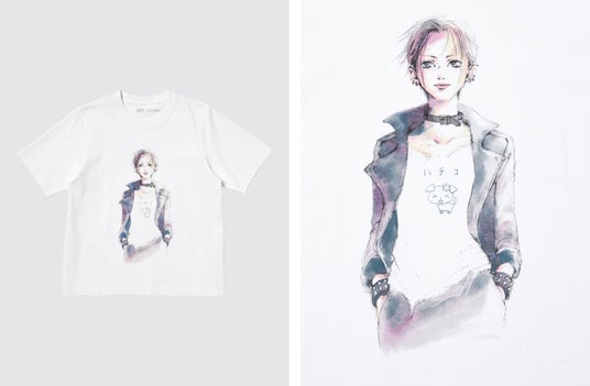 代名詞であるレザージャケットの下に着ているTシャツには、物語のもう一人の主人公である「ハチコ」が描かれています。いつまでも二人の関係性は変わらないことを表現しているかのようなデザインは、今回矢沢あい先生がUTのために描き下ろした、ファンの心に響く作品です。