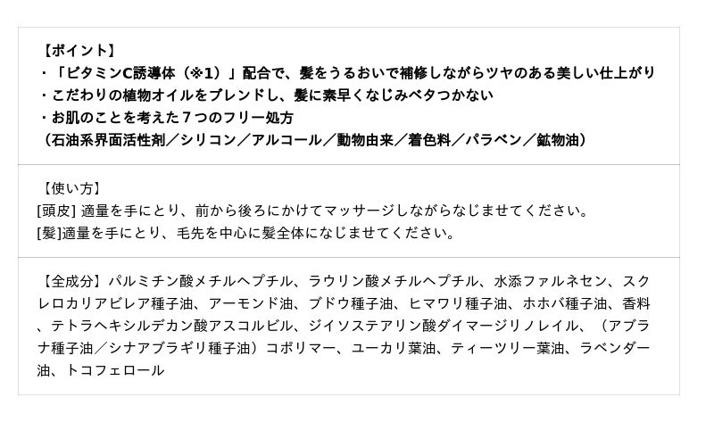髪のダメージをケアする「ビタミンC誘導体」配合「ビタミンC誘導体(※1)」配合で、乾燥やカラーリングなどで傷んだ髪をうるおいで補給し、指通りなめらかなツヤのある髪へ。