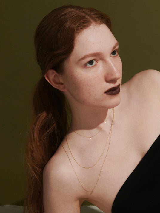 華奢なゴールドチェーンと重ねれば、知性を感じさせる洗練の表情が叶います。