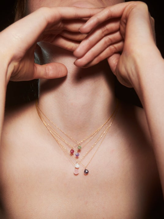 上から serendip labradorite necklace ¥24,200 serendip ruby necklace ¥24,200 serendip amethyst necklace ¥24,200 serendip moonstone necklace ¥24,200 serendip rose quartz necklace ¥24,200 serendip iolite necklace ¥24,200