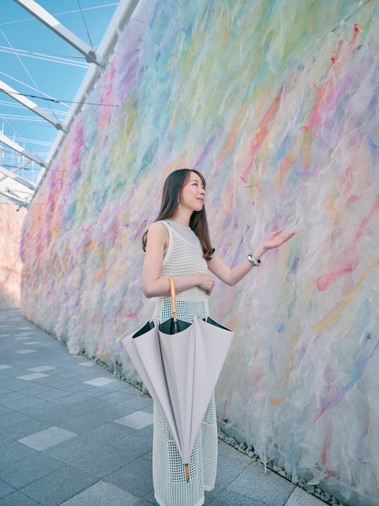 地球環境や健康への意識が高まる中、万博を訪れるすべての人々が快適に屋外を過ごせるよう、NTTパビリオンではuntuleの完全遮光日傘を無料で貸し出しています。
