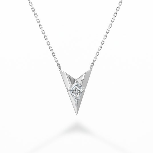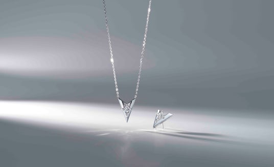 All for Victory Collectionは、ラボグロウンダイヤモンド ピンブローチとネックレスの2種類を展開。どちらもVictory(勝利)の頭文字である V をメタルで表現しています。V のデザインは紙飛行機がモチーフとなっており、“青い空を超えて、大谷翔平選手にしか到達できない未知の領域にまで夢を乗せて飛んでいって欲しい”そんな願いが込められています。V のフレームに合わせるため、緻密に調整されたカイトカットを施したラボグロウンダイヤモンドの存在感が目を惹く逸品です。