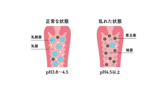 膣内には乳酸桿菌(ラクトバチルス菌)が存在していることで酸性に保たれ、雑菌の侵入や繁殖を防いでいます。乳酸桿菌が90%以上を占めるのが正常な膣内環境であるのに対し、悪玉菌や雑菌などが繁殖すると膣内環境が乱れ、ニオイやかゆみ、乾燥などのトラブルの原因になります。