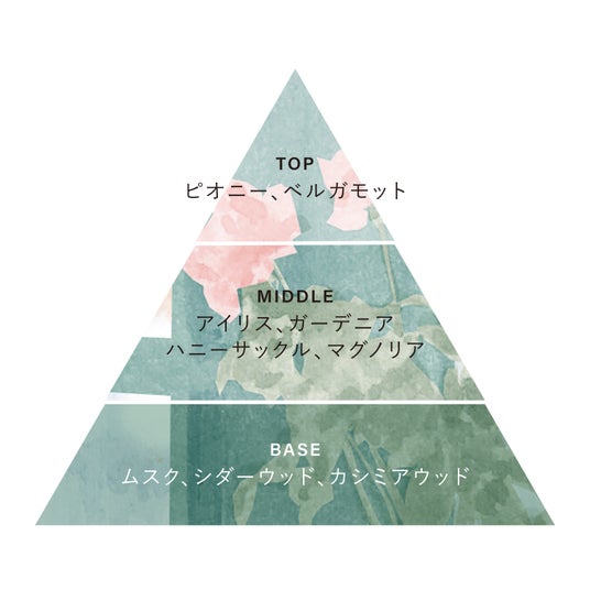 肌そのものが柔らかな光を放ち始める瞬間を描いたオードトワレ。朝露をまとったピオニーとベルガモットの透明なきらめきから、窓から降り注ぐ陽光のようなホワイトフローラルブーケの開花へ移ろっていき、ミルキーなムスクとカシミアウッドが物語を支えます。自分だけの肌の香りへと変容する、ぬくもりのあるテクスチャ。