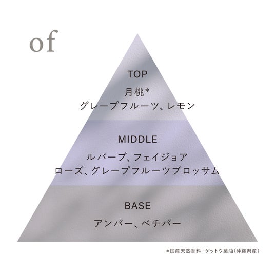 グレープフルーツに、ルバーブの清々しい酸味とフェイジョアや月桃のトロピカルなアクセントを添えて。さわやかな希望を感じる香り。