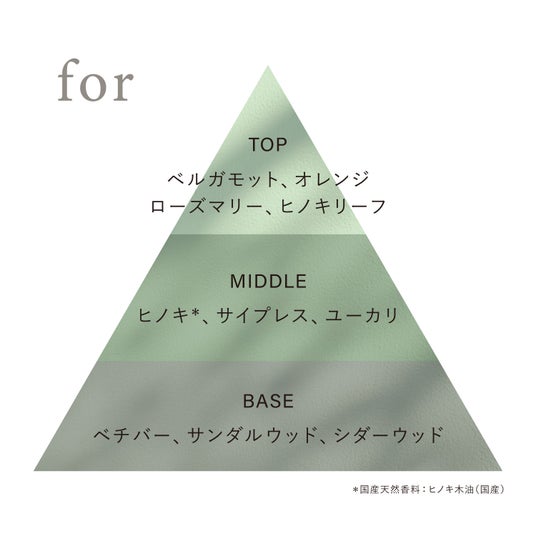 力強いベチバーを主役に、サンダルウッド、シダーウッド、サイプレスからなる重層的なウッディアコード。自然の雄大さを感じさせる香り。