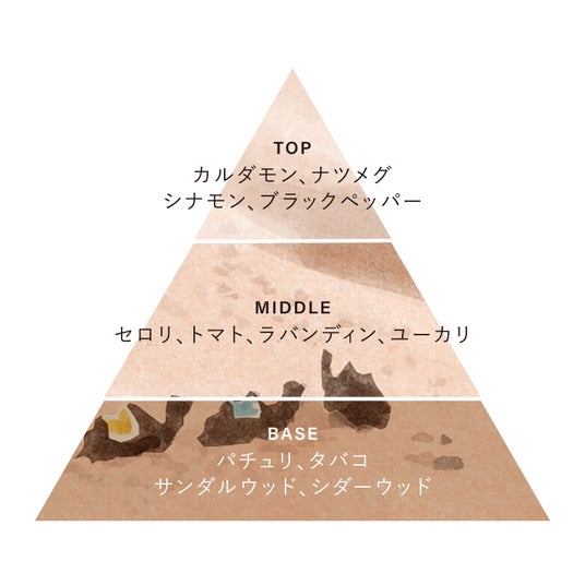 あたたかみと包容力を兼ね備えた無二の個性を描いたオードトワレ。カルダモン、シナモン、ブラックペッパーによる甘さのあるスパイスと、セロリやトマトによるベジタブルニュアンスが混ざり合い、パチュリとタバコを含んだウッディな空気がすべてをまろやかに包みます。蜃気楼のなかでスパイスティーを味わうような浮遊感。