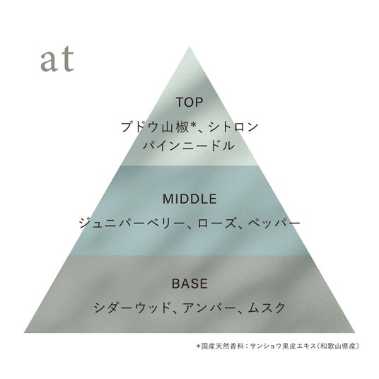 シダーウッドの静寂に、妖艶なアンバーとムスク、ジュニパーベリーの躍動感。スパイシーなブドウ山椒とペッパーが醸し出す未知の感覚。