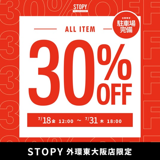 STOPYではこれまで、新店オープンイベントとして「3日間5点3,300円」などのキャンペーンを開催しご好評いただいておりましたが、今回は期間を延長し数量制限のない一律30%OFFにすることで今まで以上に、より多くのお客様に魅力的なキャンペーンになると考えております。