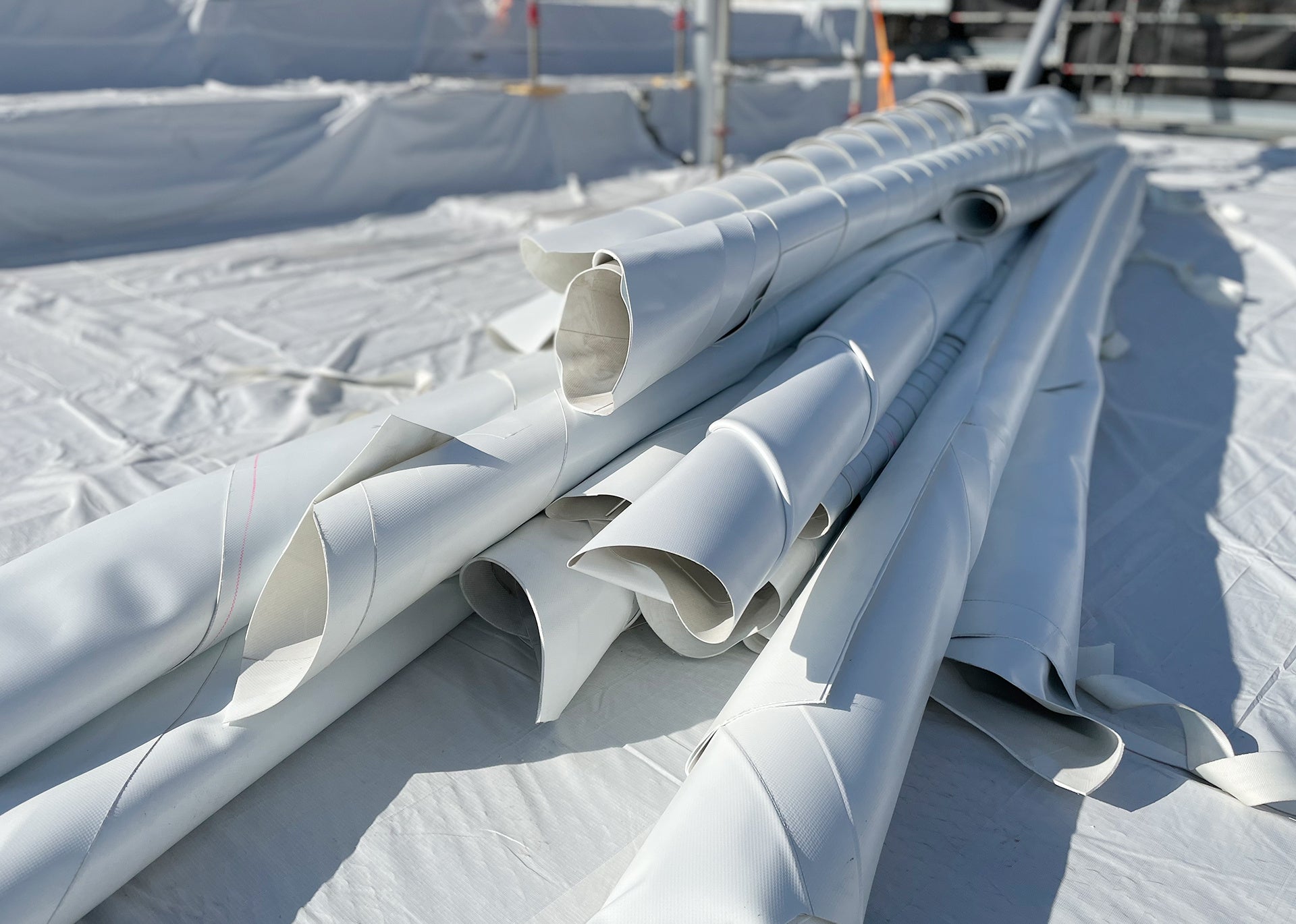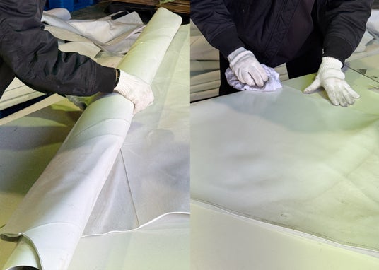 万博閉幕後、速やかに回収された屋根膜資材は、現在「洗浄」および「裁断」の工程にあります。特に製品の品質を左右する裁断工程については、高い技術力を持つ大阪の縫製工場「株式会社ふく江」※にて作業を開始しました。強靭な膜素材ならではの加工難度に対し、職人が手作業で細かな調整を重ねながら、一点一点丁寧にパーツを切り出しています。予約いただいたお客様へ一日も早くお届けできるよう、製造体制を整え、全力で進めております。