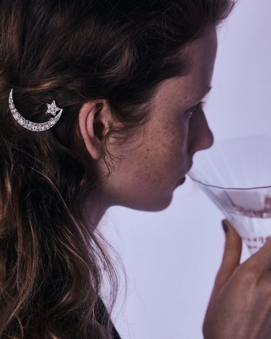 空想の夜空を流れる星のように、ガラスが華やかにきらめき、纏う人の夢を映し出してヘアスタイルに詩的な気配を宿します。