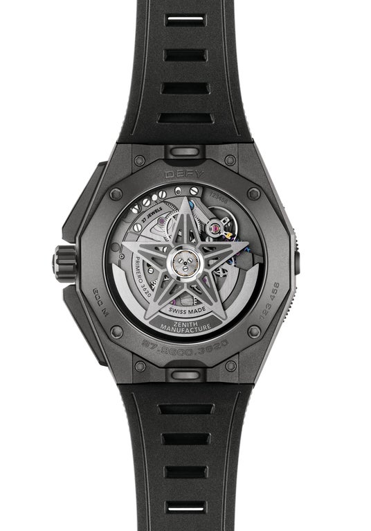 また、これほどの防水機能を備えるウォッチとしては驚くべきことに、シースルーケースバックを採用。洗練されたモダンなブラックのエル・プリメロ 3620 自動巻ムーブメントを眺めることができます。時刻のみを表示するこのキャリバーは毎時36,000振動の高振動で動作し、主要部品にシリコンを使用した耐磁性脱進機を備えています。双方向巻き上げシステムが、約60時間のパワーリザーブをしっかりと確保します。