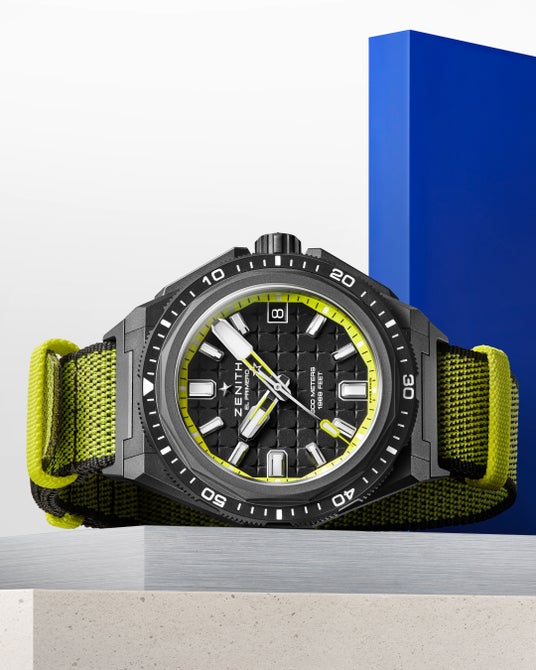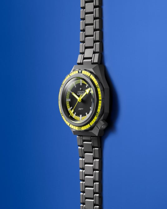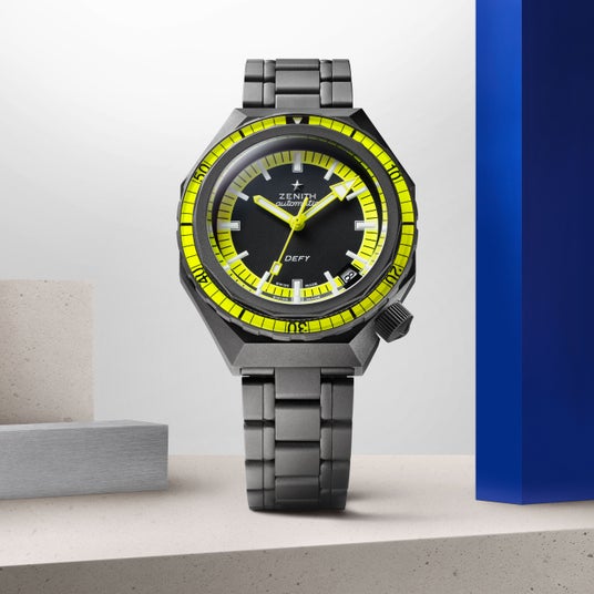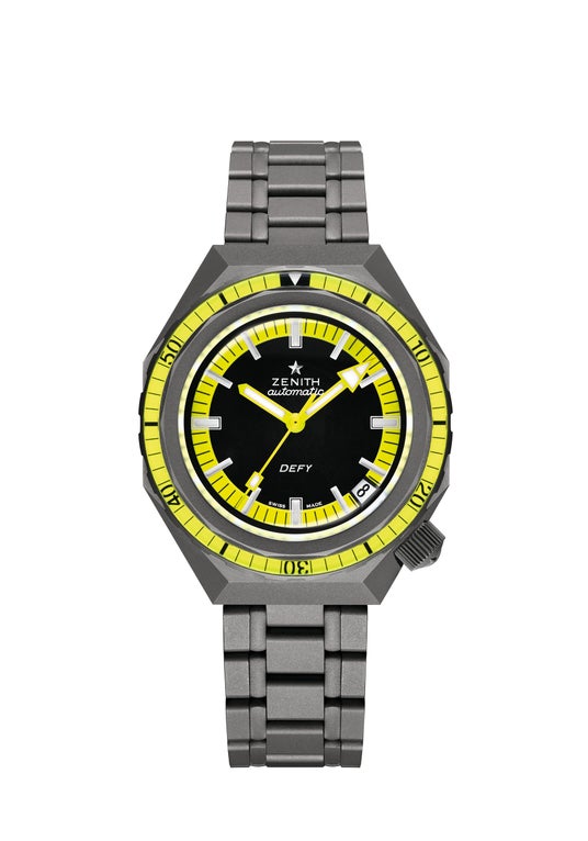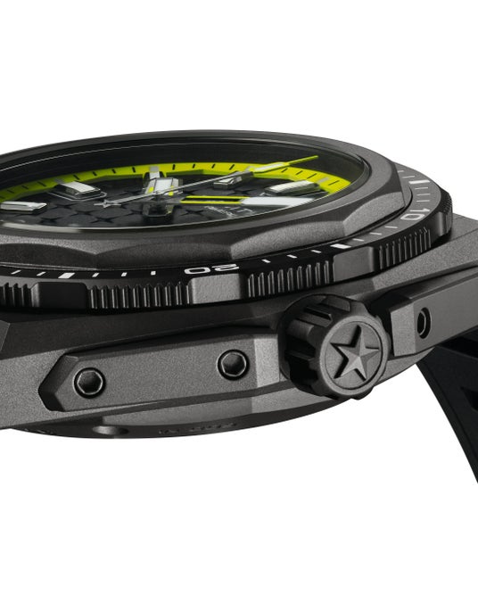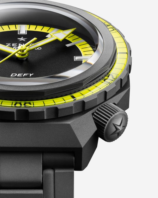 水中での過酷な冒険のために作られた「デファイ エクストリーム ダイバー シャドウ」と「デファイ リバイバル ダイバー シャドウ」は、軽量でありながら傑出した堅牢性を誇るチタンを素材としています。大胆で角張ったデファイのケースは、全体にマイクロブラスト仕上げを施し、マットな質感で力強く建築的なラインを際立たせるとともに、ステルス感の漂う独自の美学を表現しています。ダークトーンと控えめな質感によるテクニカルな洗練に、鮮やかなイエローのアクセントがエネルギッシュさと視認性を加え、機能性と印象的なスタイルを兼ね備えたタイムピースに仕上げられています。