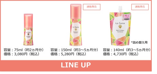 2019年に誕生した「ラサーナ 海藻 ヘア エッセンス ヒートメモリー ピンクグレープフルーツの香り」は、お風呂上りの濡れた髪に使用することで、翌朝のドライヤーやヘアアイロンなどの“熱”を味方に、スタイルを記憶させる新発想のヘア美容液です。ダメージ補修とスタイリングを同時に叶えるその機能性は、発売以来多くの支持を集めてきました。2022年に店頭でMサイズ(75ml)、通信販売で大容量サイズ(150ml)が定番化されるほどの人気を誇る本商品が、一部ドラッグストアで限定販売されていたお試しサイズへの「気軽に試したい」「小さめサイズがちょうどよい」といった多くの声に応え、ついにお試しサイズ(25ml)が定番ラインナップに加わります。これにより、初めて手に取る方にもより気軽にヘアケアルーティンに取り入れていただけるようになり、幅広いお客様にお使いいただける商品展開となりました。