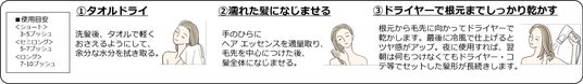 ※4 ラミナリアオクロロイカエキス(保湿成分)、アラリアエスクレンタエキス(保湿成分)、γ-ドコサラクトン(毛髪補修成分)、オリーブ果実油(保湿成分)、ローヤルゼリーエキス(保湿成分)