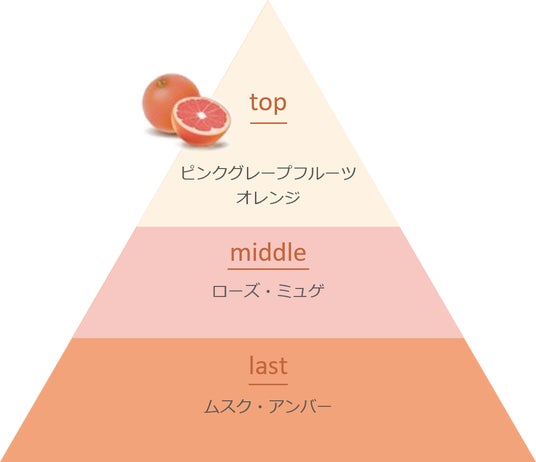 ピンクグレープフルーツの爽やかさに、オレンジの果実感がやさしく重なり、清潔感のあるフローラルと、ほんのり甘いアンバー、ムスクがふんわりと広がる。