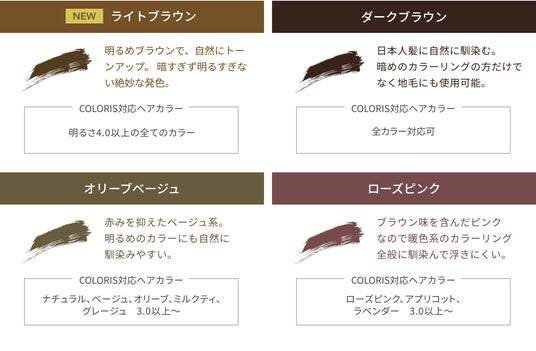 カラリスではこれまで白髪を手軽にカバーできるヘアマスカラとして、、ダークブラウン・オリーブベージュ・ローズピンクといったニュアンスカラーを展開し、「白髪を隠す」だけでなく、髪色に自然になじませることを重視した商品設計を行ってきました。