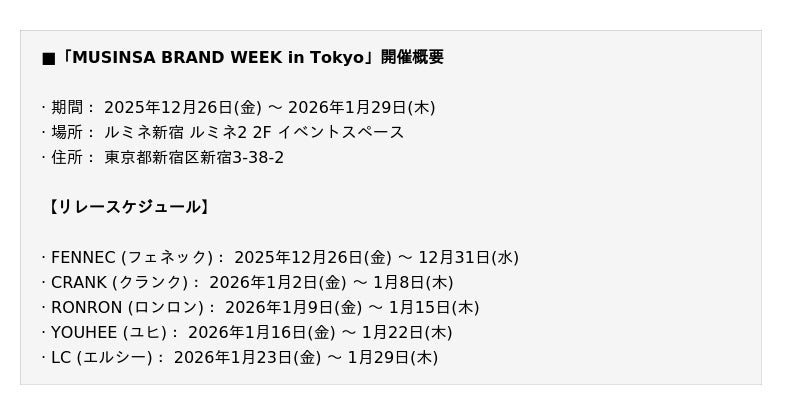 本プロジェクトは、日本市場への進出を加速させるMUSINSAのブランドインキュベーションプログラムにおける中核プロジェクトです。FENNEC(フェネック)、CRANK(クランク)、RONRON(ロンロン)、YOUHEE(ユヒ)、LC(エルシー)の5つの韓国発人気ファッションブランドが週替わりで主役となり、独創的な世界観を披露します。各ブランドは、本ポップアップのために用意した日本限定カラーの製品や、購入金額に応じた特別なノベルティを通じて、日本の顧客との接点を広げていく予定です。