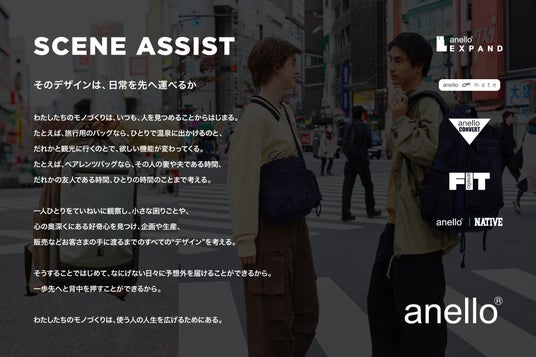anello(R)は、2005年に株式会社キャロットカンパニーが立ち上げたバッグブランドです。イタリア語で「年輪」を意味するブランド名には、「少しずつ、着実に成長し続けたい」という創業者の想いが込められています。「こだわりすぎず、でもちょっとしたポイントと機能性がある、長く愛されるバッグを丁寧に生み出すこと」を理念に、現在は35カ国・360店舗以上での展開を誇るグローバルブランドとして世界中のお客様に支持されています。誕生20周年を迎えた2025年、新コンセプト「SCENE ASSIST」を掲げ、新たなステージへと踏み出します。