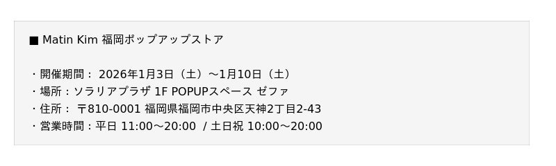 MUSINSA(ムシンサ)が日本国内で展開する韓国発ファッションブランド「Matin Kim(マーティンキム)」は、2026年1月3日(土)から1月10日(土)までの期間、福岡・天神に位置するソラリアプラザ1階 POPUPスペース「ゼファ(ZEFA)」にて、福岡エリア初となるポップアップストアを開催いたします。