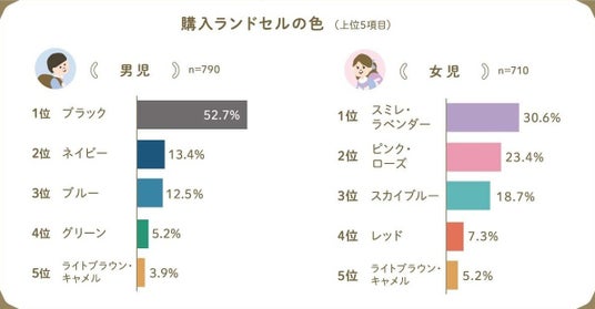 男児では「ブラック」が52.7%で1位、女児では「スミレ・ラベンダー」が30.6%でトップに。定番色に加え、アースカラーやニュアンスカラーも人気を集めています。