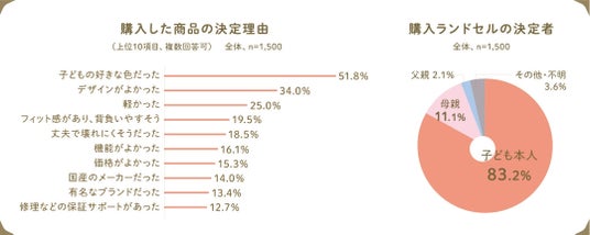 購入するランドセルの決定者として「子ども本人」と回答した割合は83.2%。購入理由のトップも「子どもの好きな色だった」(51.8%)でした。