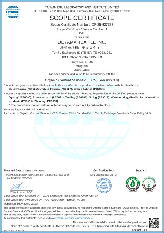 Ueyama Group / 株式会社植山テキスタイル(大阪府守口市、代表取締役:植山展行)は、オーガニック繊維製品の国際認証「OCS(Organic Content Standard)」を取得しました。これにより播州産地において、織布から染色・流通までを含むサプライチェーンでOCS認証生地を供給できる体制を構築しました。