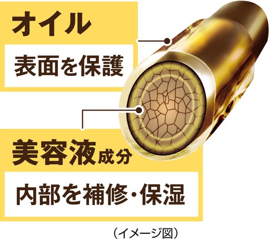 ノンシリコンのとろけるようなジェルが髪にすっとなじみ、内部までしっかり浸透。オイルをジェル化することで、髪表面を保護するオイルと一緒に濃密な美容液成分を髪の内部まで届けます。髪内部を集中補修しながら髪をオイルコーティングするから、傷んだゴワゴワ髪も毛先までうるおいます。