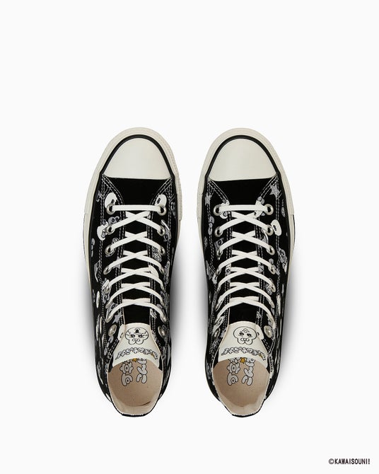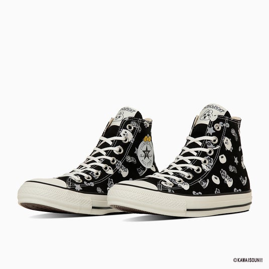 オールスターのベーシックなハイカットモデルに「可哀想に!」の人気作品「おぱんちゅうさぎ」「んぽちゃむ」の世界観をシューズ全体に落とし込んだデザイン。
