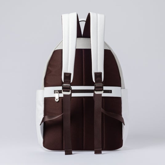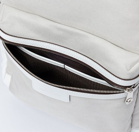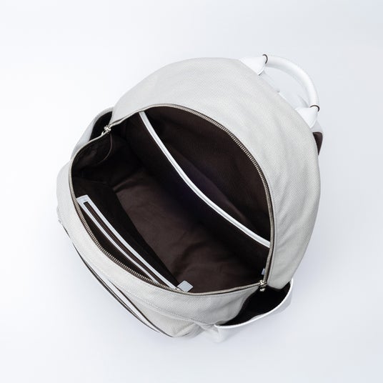 動きに寄り添うデイパック。シンプルなデザインに少し大きめのサイズ感を掛け合わせ、幅広いシーンに対応します。A4サイズが収まる容量に加え、マチ幅もしっかり確保しており、通勤や外出などアクティブな場面でも快適に使用できます。フロントポケット内には小物の整理に便利なメッシュポケットを備え、必要なものをスムーズに取り出せる設計です。さらに、背面にはキャリーバッグに装着可能なアジャスターベルトを配し、旅行時の利便性にも配慮しています。キャンバスの軽やかさとホワイトレザーのクリーンな印象が、機能性と上品さを両立した仕上がりです。