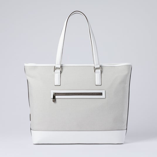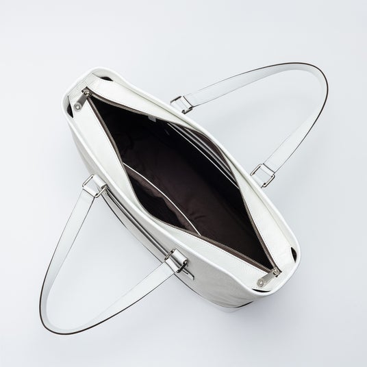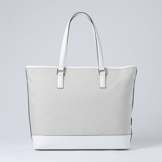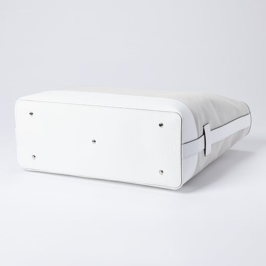 荷物をたっぷり収納できる大容量トートバッグ。開口部は広く設計されており、荷物の出し入れがしやすく、日常使いはもちろん1泊程度の旅にも対応します。背面にはキャリーバッグに取り付け可能なストラップを備え、移動時の利便性にも配慮しました。底面には底鋲を配し、床置き時の汚れや傷を防ぐとともに、安定感と上質な印象を高めています。キャンバスの軽やかさにホワイトレザーが程よいアクセントとなり、移動のシーンにも余裕を感じさせる佇まいに仕上げています。