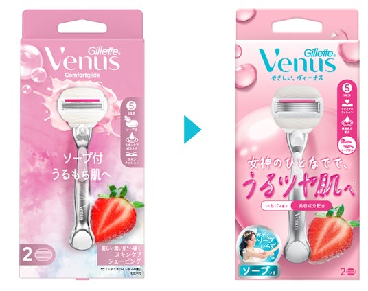 そこで今回、カミソリ使用者の悩みやニーズに応えるため、「ジレットヴィーナス」はジェル・ソープ付きカミソリ「コンフォートグライド」シリーズの大型アップデートをいたします。また、現在ご好評いただいている敏感肌向け製品も「コンフォートグライド」シリーズに追加させていただきます。