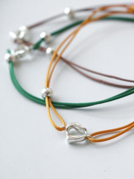 カラーアイテムを身に着けたくなる季節。そんなマインドに寄り添ってくれるキャッチーな色使いのコードブレスは、手元のボリューム感も楽しめるおすすめのアイテム。ゴールド、シルバーどちらも合わせやすいので自分らしい重ね着けが楽しめます。着け心地も軽く、気軽につけられるのも◎!コロンとしたフォルムが愛らしいモチーフには、ふとした時に蘇るハートフルな想い出をメッセージにして刻みました。