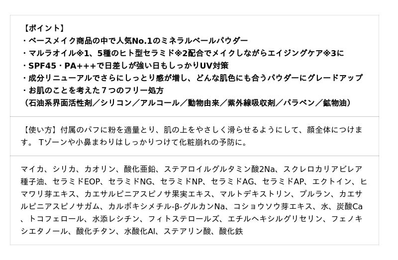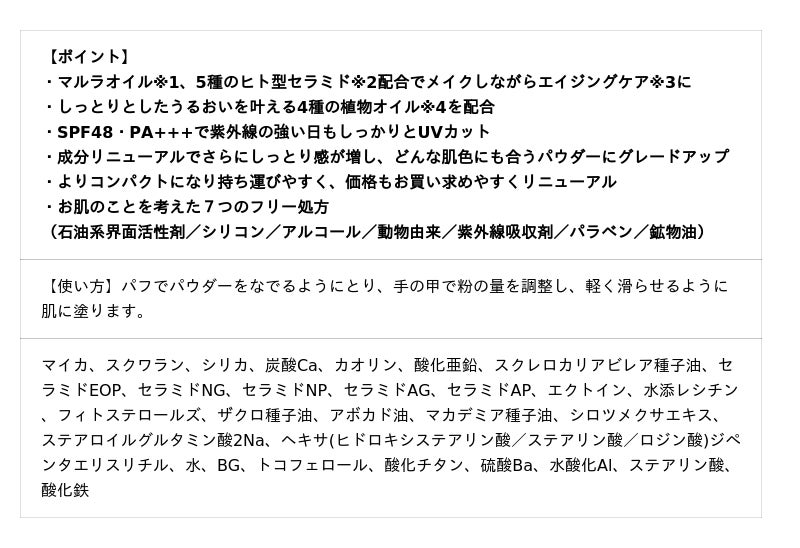 肌へのやさしさや軽いつけ心地はそのままに、独自のモイスチャーマイカ、肌色補正パウダーを追加配合しました。