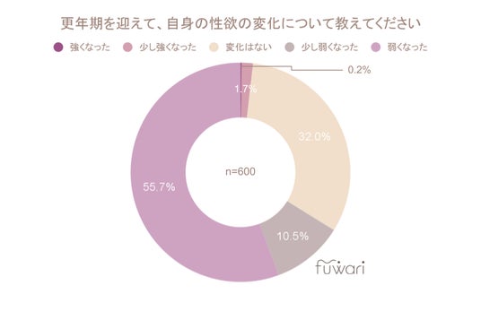更年期後の性欲については、一番多い回答は「弱くなった(55.7 %)」、「少し弱くなった(10.5 %)」で、約65%の方は性欲が減少傾向。一方で「変化はない」は32%と、変化を感じない方も一定数存在しました。「少し強くなった(1.7%)」「強くなった(0.2%)」と答えた人は合わせて1.9%でした。