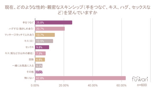 「現在、どのような性的・親密なスキンシップを求めていますか」という質問には、50−60代女性の62.8 %が「特にない」と回答。一方で、約4割の女性がスキンシップを求めていることも明らかになりました。その内容は「手を繋ぐ(25.8 %)」、「ハグする(20.7 %)」、「マッサージやタッチで触れ合う(13.7 %)」が上位となり、軽く触れるような優しいスキンシップが好まれている傾向が見られました。
