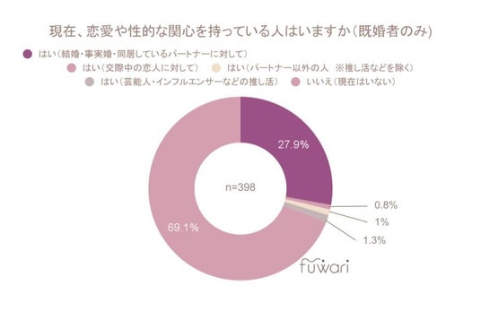 上記の「現在、恋愛や性的な関心を持っている人はいますか」という質問を、50−60代既婚者女性(398人)に限定して分析したところ、パートナーに対して恋愛・性的な関心を持っている人は27.9%にとどまりました。つまり、69.1%の既婚女性は夫に恋愛・性的な感情を持っていないことが明らかになりました。