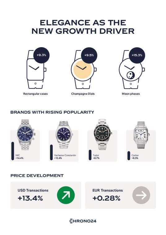 - クラシックなディテール:ムーンフェイズが前年比で15.3%の伸びを見せ、人気が急上昇。手首でエレガントに映えるディテールが再び評価されていることが明らかに。