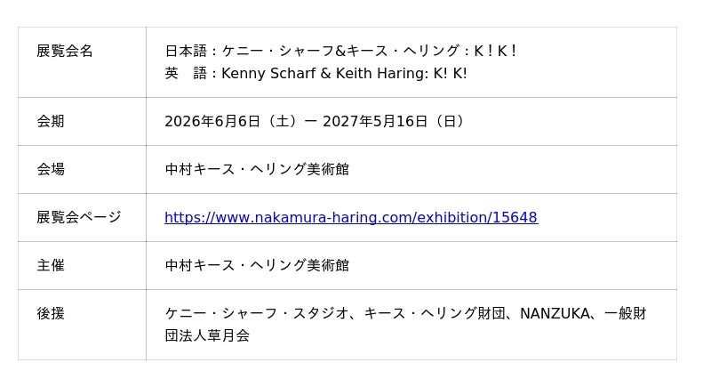 中村キース・ヘリング美術館(山梨県北杜市)では、2026年6月6日(土)から2027年5月16日(日)まで、ケニー・シャーフ(1958-)とキース・ヘリング(1958-1990)を紹介する展覧会「ケニー・シャーフ&キース・ヘリング:K!K!」を開催いたします。
