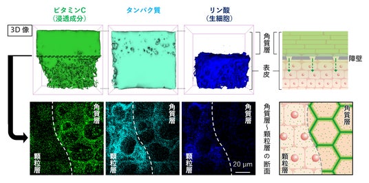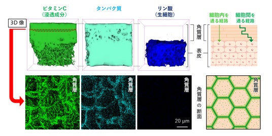 日本メナード化粧品株式会社(愛知県名古屋市中区丸の内3-18-15、代表取締役社長:野々川 純一)はこれまでに、名古屋大学大学院 生命農学研究科 森林化学研究室(名古屋市千種区不老町、准教授:青木弾)及びあいち産業科学技術総合センター(愛知県)と共同で、化粧品や医薬品などに配合されている成分がどのように皮膚へ浸透していくのかについて、より生体に近い状態かつ3次元でイメージングできる技術を開発しました※。今回、この技術を活用することにより、皮膚に塗布したビタミンCの皮膚内部への浸透経路を立体的に解析することに成功しました。