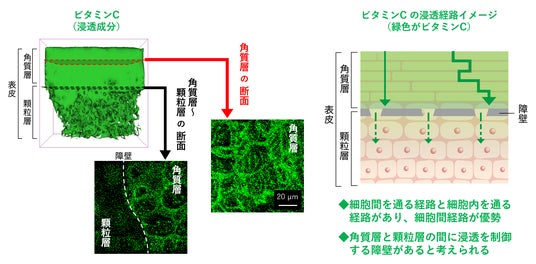 この結果から、ビタミンCが皮膚内部へ浸透する過程において、角質層と顆粒層との間には、ビタミンCの浸透を著しく制御する何らかの障壁が存在すると考えられました。