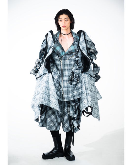 今回のコレクションに使用するチェック柄は全てオリジナルで作成し、生地加工にもこだわっています。日常着としても衣装としても使用できる洋服を作ります。